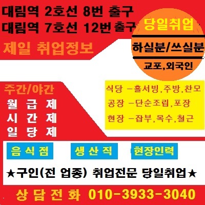 - 본 게시물은 제일직업소개소 에서 제공한 자료로 개인정보를 포함하고 있으며 임의유포, 수집, 배포가 금지됩니다.